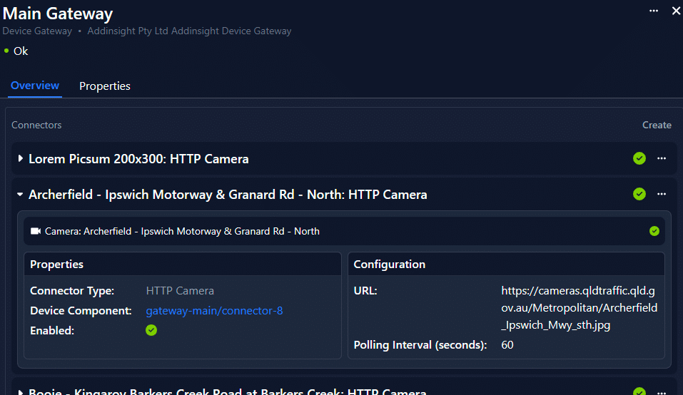 At the heart of this translation process are “connectors”, which the gateway uses to interface with different device types. This preview includes a Camera Connector, allowing users to easily configure image downloads from an HTTP endpoint at regular intervals. Setup is simple: just provide a name, URL, and polling interval to create a new connector, then link it to a Camera resource. The camera images will automatically update in the Addinsight UI based on the configured interval.